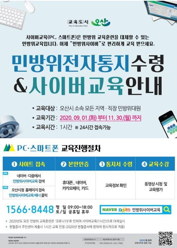 오산시 홈페이지에서 민방위사이버교육 배너를 클릭하거나 인터넷 포털에서 ‘민방위사이버교육'에 접속한 뒤 본인인증을 거친 후 교육을 이수하면 된다.