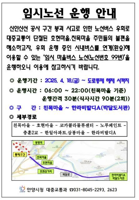 [ 중앙뉴스미디어 ] 안양시는 신안산선 공사현장 붕괴 지점 인근 도로가 전면 통제되면서 대중교통 불편을 겪고 있는 박달동 친목·호현마을 주민 등을 위해 오는 18일부터 마을버스 99번(1대)을 긴급 투입해 임시 운행한다고 17일 밝혔다.
