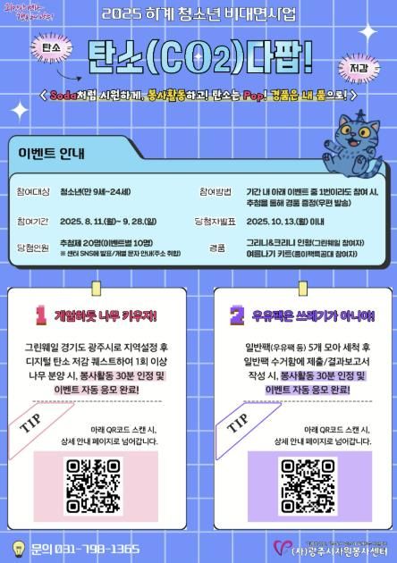 [ 중앙뉴스미디어 ] 사단법인 광주시자원봉사센터는 여름철 폭염과 탄소 배출 증가에 대응하기 위해 청소년들이 쉽고 간편하게 참여할 수 있는 비대면 봉사활동 '탄소(CO2)다팝!' 이벤트를 오는 8월 11일부터 9월 28일까지 추진한다.