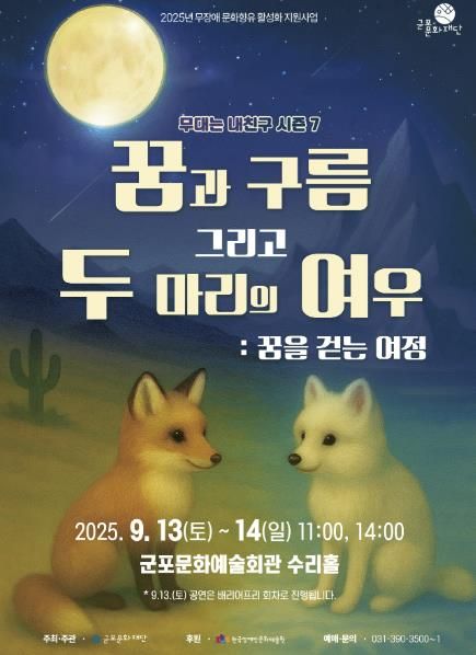 [ 중앙뉴스미디어 ] 군포문화재단은 9월 13일과 14일 군포문화예술회관 수리홀에서 선보이는 어린이 창작 뮤지컬 '꿈과 구름 그리고 두 마리의 여우 – 꿈을 걷는 여정' 티켓을 오는 8월 13일 14시부터 군포문화재단 홈페이지와 놀유니버스를 통해 오픈한다고 밝혔다.