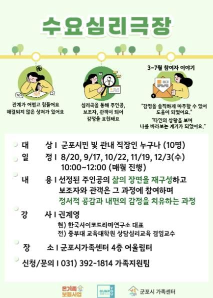 [ 중앙뉴스미디어 ] 군포시가족센터는 매월 셋째 주 수요일, 심리적 갈등과 대인관계 문제 해결을 돕는 집단심리치료 프로그램 ‘수요심리극장’을 운영하고 있다.