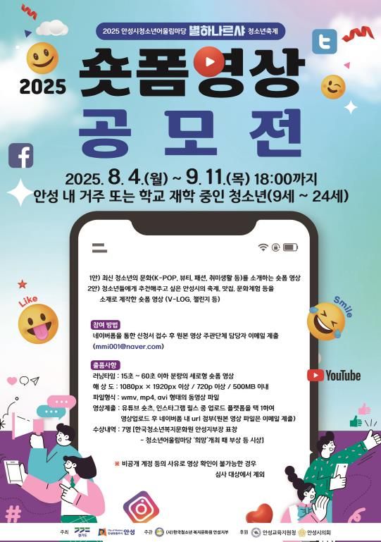 김영식 지부장은 “숏폼 공모전은 동아리축제를 청소년의 시선으로 홍보하며, 자신의 재능과 개성을 자유롭게 표현할 수 있는 기회”라며 “많은 청소년이 참여해 안성의 매력을 널리 알리길 기대한다”고 말했다.