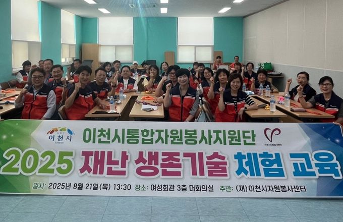 [ 중앙뉴스미디어 ] 이천시 자원봉사센터는 8월 21일 여성회관 3층 대회의실에서 이천시통합자원봉사지원단 소속 자원봉사자 30여 명이 참여한 가운데 ‘2025년 이천시통합자원봉사지원단 재난 생존기술 체험 교육’을 진행했다.