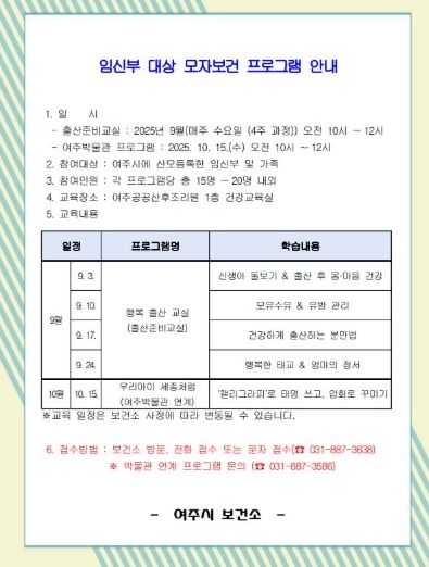 [ 중앙뉴스미디어 ] 여주시보건소 건강증진과는 관내 임신부 및 가족을 대상으로 출산과 육아에 대한 실질적인 도움을 제공하기 위해 총 4회에 걸쳐 2025년도 하반기 '출산준비교실'을 운영한다.