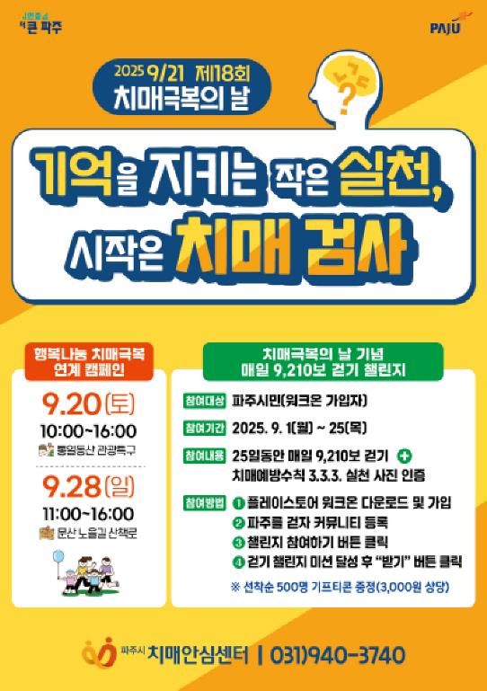 치매극복의 날(매년 9월 21일)은 치매에 대한 사회적 관심을 높이고 치매 관리의 중요성을 알리기 위해 제정된 법정기념일로, 파주시는 ‘기억을 지키는 작은 실천, 시작은 치매 검사’를 표어로 정하고 시민 인식 개선에 나선다.