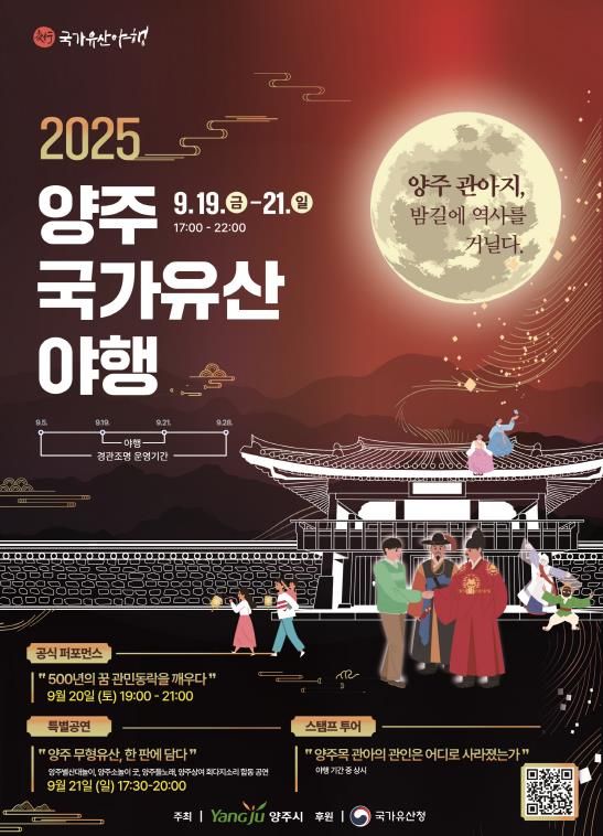 올해 '양주국가유산 야행'은 2025년 9월 19일부터 21일까지 3일간 조선시대 지방 행정과 교육, 문화의 중심지였던 양주관아지 일원에서 열린다.