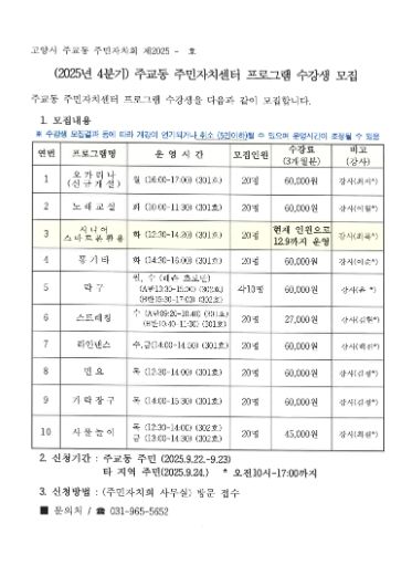 [ 중앙뉴스미디어 ] 고양특례시 덕양구 주교동 주민자치회는 오는 9월 22일부터 24일까지 2025년 4분기 주민자치센터 문화강좌 프로그램 수강생을 모집한다.