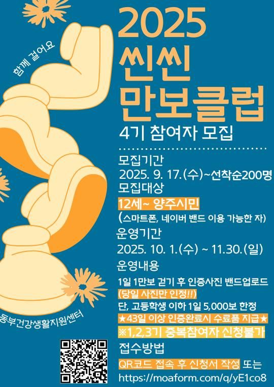 [ 중앙뉴스미디어 ] 양주시보건소 동부건강생활지원센터에서 양주시민의 걷기 실천율 향상과 신체활동 증진을 위해 12세 이상 스마트폰 또는 네이버 밴드를 이용할 수 있는 시민을 대상으로 '씬씬 만보클럽 4기' 참여자를 모집한다.
