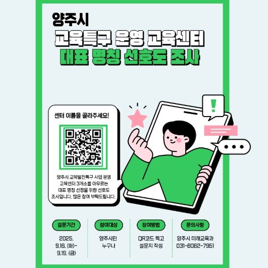 설문 후보로는 ▲양주 아이 배움숲 : 배움이 숲처럼 확장되는 공간, ▲양주 드림온(DREAM ON) 센터 : 꿈을 이어가며 발전하는 거점, ▲양주 드림 아이(DREAM-i) 센터 : 꿈꾸는 아이들의 상징, ▲양주 꿈자람센터 : 꿈이 자라나는 교육·돌봄터, ▲양주 미래 ON센터 : 미래를 켜는 성장 공간 등 5개 명칭을 제시했으며, 조사 결과를 바탕으로 오는 19일 최종 명칭을 확정한다.