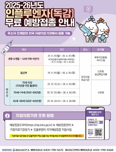 [ 중앙뉴스미디어 ] 하남시가 감염병 예방 및 확산 방지를 위해 오는 9월 22일부터 내년 4월 30일까지 어린이, 임신부, 노약자 등을 대상으로 독감(인플루엔자) 국가예방접종을 무료로 시행한다고 밝혔다.