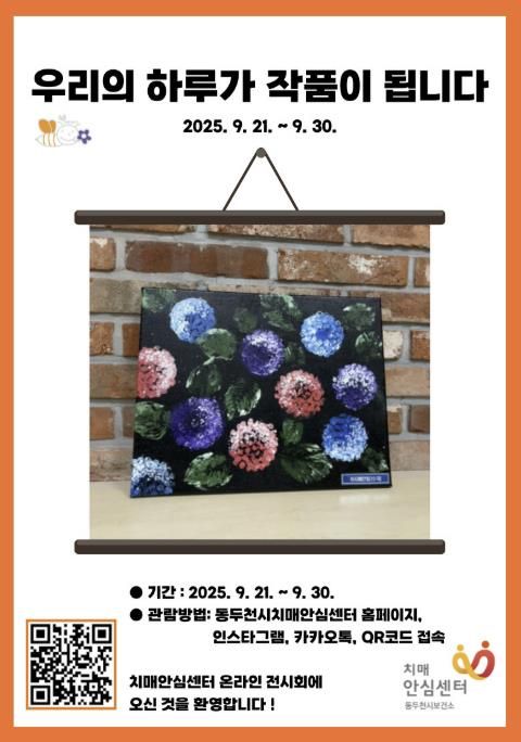 관람을 원하는 시민은 동두천시치매안심센터 홈페이지와 카카오톡 채널, 또는 포스터의 QR코드를 통해 온라인 전시를 자유롭게 감상할 수 있다.