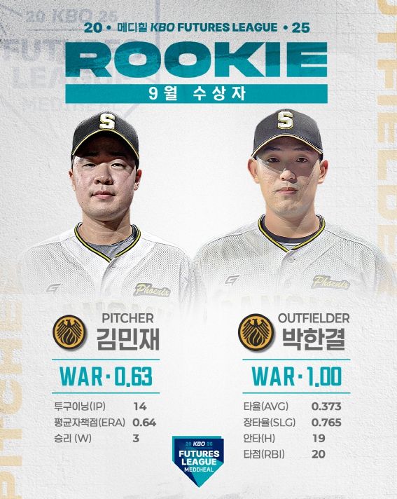 [ 중앙뉴스미디어 ] 2025 메디힐 KBO 퓨처스리그의 9월 퓨처스 루키상 수상자로 투수 부문에는 상무 김민재가 WAR 0.63, 타자 부문에는 상무 박한결이 WAR 1.00을 기록하며 각각 선정됐다.