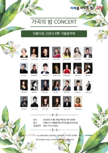 [ 중앙뉴스미디어 ] 고양특례시가 후원하고, (사)한국예술문화단체총연합회 고양지회가 주최하며 (사)한국음악협회 고양지부가 주관하는 ‘2025 가곡의 밤 – 아름다운 고양시 8경(景) 가을 음악회’가 오는 16일 오후 7시 30분, 고양아람누리 아람음악당에서 개최된다.
