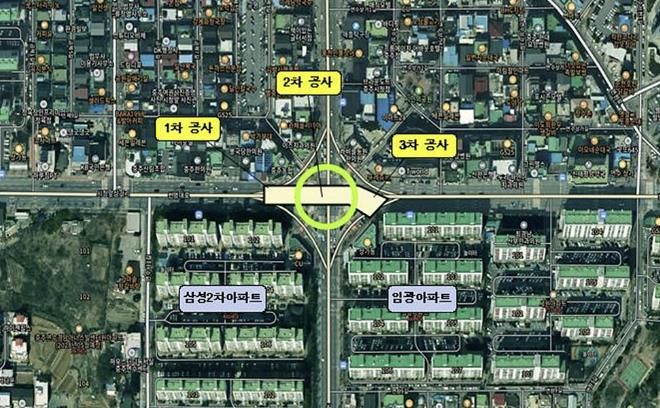 1단계(10월 15일~11월 30일) 교차로 준비 작업 기간에는 연수동 방향 편도 3차로 중 바깥 1개 차로만 운영해 좌회전과 직진 차량 모두 해당차로를 이용해야 한다.