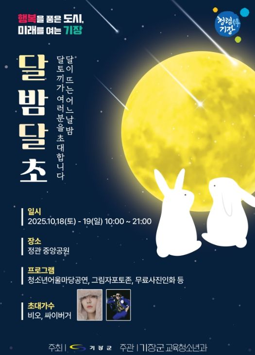 [ 중앙뉴스미디어 ] 기장군은 오는 18일부터 19일까지 정관읍 중앙공원 일원에서 2025 기장군청소년어울마당 ‘달밤달초’를 개최한다고 15일 밝혔다.