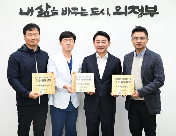 [ 중앙뉴스미디어 ] 의정부시는 10월 15일 시장실에서 ‘길고양이 중성화사업 우수 동물병원’ 인증패 전달식을 열고, 사업에 적극 참여해 지역 동물복지 문화 확산에 기여한 동물병원을 격려했다.