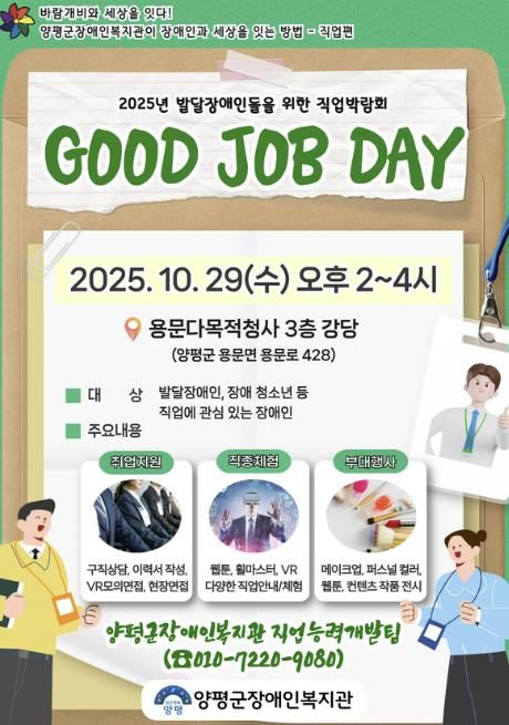 [ 중앙뉴스미디어 ] 대한불교조계종사회복지재단이 운영하는 양평군장애인복지관은 오는 29일 오후 2시부터 4시까지 용문다목적청사 3층 강당에서 발달장애인의 직업 탐색 기회를 지원하기 위한 직업박람회 ‘GOOD JOB DAY’를 개최한다.