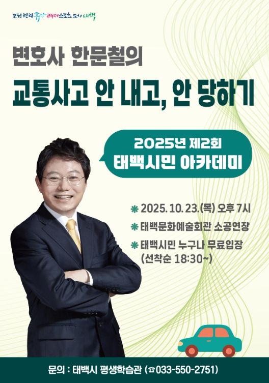 [ 중앙뉴스미디어 ] 태백시는 시민들의 교통안전 의식을 높이고 사고 예방 문화를 확산하기 위해 오는 23일 오후 7시, 태백문화예술회관 소공연장에서 ‘제2회 태백시민 아카데미’를 개최한다고 밝혔다.
