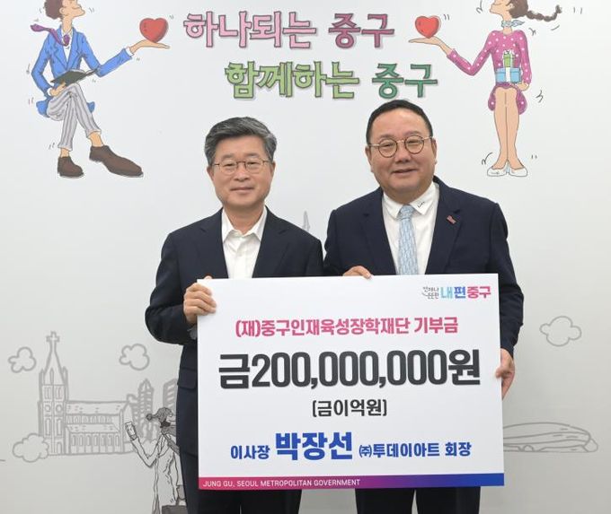 [ 중앙뉴스미디어 ] 서울 중구는 ㈜투데이아트 박장선 회장이 서울중구인재육성장학재단에 지역 인재 육성을 위한 장학금 2억원을 기탁했다고 22일 밝혔다. 전달식은 지난 21일 중구청장실에서 열렸다.