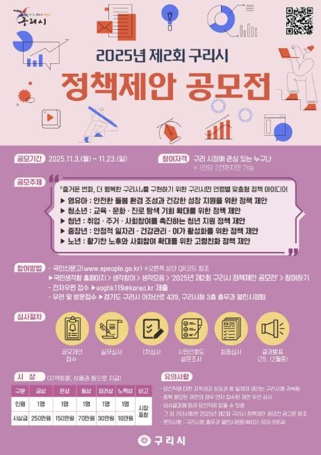 [ 중앙뉴스미디어 ] 구리시는 오는 11월 3일부터 11월 23일까지'2025년 제2회 구리시 정책 제안 공모전'을 개최한다고 밝혔다. 이번 공모전의 주제는 ‘구리 시민(영유아·청소년·청년·중장년·노년) 나이별 맞춤형 정책 아이디어’다.