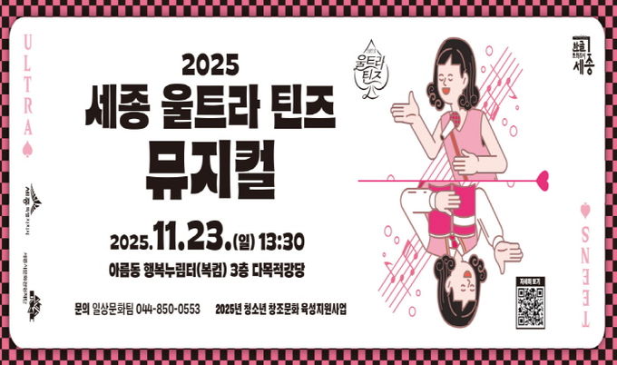 [ 중앙뉴스미디어 ] 세종시문화관광재단은 11월 23일, 아름동 행복누림터 3층 다목적강당에서 청소년 무대예술 교육 프로그램의 성과를 선보이는 ‘2025 세종 울트라 틴즈 뮤지컬’ 공연을 개최한다. 이번 공연은 약 4개월간의 교육 과정을 통해 성장한 청소년들의 창작 역량을 발표하는 자리다.