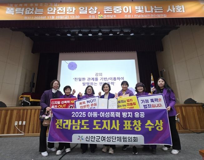 [ 중앙뉴스미디어 ] 신안군여성단체협의회(회장 안미영)가 11월 28일 전남여성가족재단에서 개최된 ‘2025년 여성폭력추방주간 기념행사’에서 여성폭력 방지 유공을 인정받아 전남도지사 표창을 수상하는 영예를 안았다.