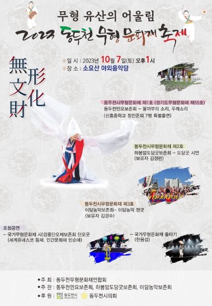[ 중앙뉴스미디어 ] 동두천시는 동두천 무형문화재연합회 주관으로 지역의 문화예술 자원개발 및 전통예술의 계승발전과 무형 유산의 저변확대에 기여하고자 10월 7일 13시 소요산 야외음악당에서 ‘2023 동두천 무형문화재 축제’를 개최한다.
