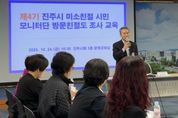 [ 중앙뉴스미디어 ] 진주시는 24일 시청 3층 문화강좌실에서 ‘2025년 미소친절 시민모니터단 교육’을 실시해 친절행정 실현에 앞장서고 있다. 이번 교육에는 미소친절 시민모니터단 25명이 참석해 모니터단의 역할과 평가체계를 이해하고, 읍면동 민원현장의 친절서비스 개선을 위한 암행 모니터링 방법 등 실무중심의 교육이 진행됐다. 또한 시민이 만족하는 친절행정 실현을 위한 의견 교환도 활발히 이뤄졌다. 미소친절 시민모니터단의 조사 결과는 올해 상·하반기 2회에 걸쳐 실시한 전화 친절도 평가 점수와 합산해 연말 읍면동 종합평가에 반영될 예정이다. 한편 진주시 미소친절 시민모니터단은 전 읍면동을 대상으로 ▲공무원의 친절도 ▲업무해결 노력도 ▲신속성 및 정확성 등을 시민의 눈높이에서 평가하고, 민원서비스 제도개선 의견을 제시하는 등 공무원 친절역량 강화를 위한 다양한 활동을 펼치고 있다. 장정오 민원여권과장은 “미소친절 시민모니터단은 시민의 눈높이에서 행정서비스를 살피는 소중한 파트너이다”면서 “앞으로도 시민이 체감할 수 있는 친절행정 구현을 위해 모니터단과의 소통을 강화하겠다”고 말했다. &