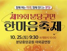 [ 중앙뉴스미디어 ] ‘제19회 분당구민 한마음 축제’가 오는 10월 25일 오전 9시 30분~오후 1시 중앙공원 야외공연장에서 열린다. 성남시 분당구가 후원하고 분당구민 한마음 축제 추진위원회(위원장 김성민)가 주최해 열리는 이번 행사는 지역사회 화합 분위기를 조성하고자 ‘함께 여는 미래, 함께 만드는 분당’을 주제로 진행된다. 이날 성남시립합창단과 시민 예술단 아인스바움의 공연으로 축제의 화려한 막을 연다. 이어 수내3동, 정자3동, 야탑1동, 백현동 주민자치센터 문화 프로그램에 참여 중인 4개 팀이 난타, 한국무용, 줌바, 에어로빅 등 흥겨운 공연으로 중앙무대를 꾸민다. 초청 가수 김용필(미스터트롯2 출신)의 ‘오히려 좋아’, ‘낭만의 계절’, 바이올리니스트 백진주와 소프라노 유경진이 듀엣으로 연주하는 영화음악(OST) ‘캐리비안의 해적’, ‘대부’, 성남청년프로예술단의 댄스 공연도 열려 축제 분위기를 달군다. 중앙공원 황새울광장에는 배틀 로봇, 4족 보행 로봇 등 6개의 4차산업 체험존, 시민 체험용 드론 축구존, 추억의 사진관을 차려 운영한다. 장애인 복합사업장인 굿윌스토어 물