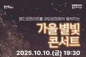 [ 중앙뉴스미디어 ] 용인문화재단은 오는 10월 10일 오후 7시 30분, 새롭게 단장한 용인포은아트홀 야외광장에서 ‘가을 별빛 콘서트’를 개최한다. 이번 공연은 가을밤의 정취 속에서 시민들에게 특별한 추억을 선사하고, 용인의 대표 광장형 축제를 알리기 위해 마련됐다. ‘가을 별빛 콘서트’에는 가수 거미, 유리상자 이세준, 힙합 아티스트 행주·마린·블랙나인, 그리고 소프라노 정나리가 출연해 대중음악·클래식·힙합을 아우르는 다채로운 무대를 선보일 예정이다. 이번 공연은 무료로 진행되며, 사전 댓글 이벤트를 통한 예약석(현재 마감)과 공연 당일 현장 선착순 입장석으로 운영된다. 현장 참여자는 오후 5시부터 대기 후 오후 6시부터 선착순 입장할 수 있으며, 돗자리석과 계단석 등 다양한 방식으로 자유롭게 관람할 수 있다. 특히 이번 ‘가을 별빛 콘서트’는 시민 참여형 현장 이벤트도 마련됐다. 입장객 1,800명에게는 별 모양 무드등이 기념품으로 증정되며, 공연 전에는 중계 카메라 이벤트를 통해 용인포은아트홀 공연 티켓이 제공된다. 본 공연에 앞서 오후 4시부터 예술교육 매개자 ‘아트러너’가 운영하는 문화예술 체험부스가