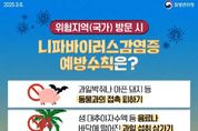[ 중앙뉴스미디어 ] 오산시는 질병관리청이 지난 9월 8일 니파바이러스감염증을 제1급감염병으로 신규 지정함에 따라 시민들에게 감염예방수칙 준수와 개인위생 관리에 철저를 기해줄 것을 당부했다. 니파바이러스감염증은 현재 국내 유입 가능성은 낮지만, 인체 감염 시 치명률이 40~75%에 달하는 것으로 알려져 있어 철저한 관리가 필요한 신종감염병이다. 니파바이러스는 사람과 동물 모두에 감염될 수 있으며, 감염된 동물(과일박쥐, 돼지 등)과의 접촉이나 오염된 식품(대추야자수액 등) 섭취를 통해 전파될 수 있다. 또한 환자의 체액과 밀접 접촉 시 사람 간 전파도 가능하다. 특히 최근 환자 발생이 지속되고 있는 검역관리지역인 인도와 방글라데시를 방문한 여행객은 귀국 후 14일 이내에 발열, 두통, 인후통 등 의심 증상이 나타날 경우 질병관리청 콜센터 또는 관할 보건소로 즉시 신고해야 한다. 예방을 위해서는 ▲야생동물과의 접촉 피하기 ▲오염된 음료·식품 섭취 금지 ▲환자와 직접 접촉 피하기 ▲손 씻기 등 개인위생 관리 철저가 필요하다. 김태숙 오산시보건소장은 “코로나19 경험을 통해 신종감염병에 대한