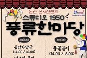 [ 중앙뉴스미디어 ] 논산시와 논산문화관광재단(이사장 백성현)은 오는 11월 29일부터 30일까지 양일간, 선샤인랜드 1950스튜디오에서 ‘스튜디오1950 풍류 한마당’을 개최한다. 이번 행사는 전통문화 공연과 시민참여형 체험 프로그램이 어우러진 복합문화행사로, 지역민과 관광객이 함께 즐기는 소통의 장이 될 예정이다. 행사기간 동안 오후 13:00~17:00까지 다양한 프로그램이 진행되며, 메인 공연으로는 전통시장 상인들의 일상과 애환을 그린 마당극이 29일 오후 14:00와 16:00시 두 차례 펼쳐진다. 생생한 연기와 서민들의 정이 묻어나는 이야기로 구성된 이번 마당극은 관객들에게 웃음과 감동을 선사할 예정이다. 공연이 끝난 뒤에는 출연진과 관람객이 함께 참여하는 거리 코스튬 퍼레이드가 약 20~30분간 진행된다. 배우와 시민이 어우러져 선샤인랜드 1950스튜디오 거리 곳곳을 행진하며 현장 분위기를 더욱 뜨겁게 달굴 예정이다. 또한 공연 중간 시간에는 지역 가수의 버스킹 공연이 이어져 관람객이 자유롭게 음악을 즐길 수 있는 열린 문화 무대로 꾸며진다. 이와 함께 상시 운영되는 체험 프로그램도 눈길을 끈다.