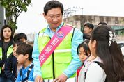 [ 중앙뉴스미디어 ] 이상일 용인특례시장은 14일 아침 처인구 고림로에 위치한 고진초등학교 정문 횡단보도에서 어린이들의 안전한 통학환경 조성을 위한 교통지도 봉사활동에 참여하고 학교 주변 통학로를 점검했다. 이상일 시장은 서경란 고진초 교장, 녹색어머니회·학부모회·학생 등 60여명과 함께 등굣길 어린이들이 안전하게 길을 건널 수 있도록 돕고 운전자들에게 ‘어린이보호구역 내 서행’을 당부하는 교통안전 캠페인을 펼쳤다. 이 시장은 통학로 현장을 둘러보며 ▲고림고 유리방음벽 모서리 보호대 설치 ▲고림고~힐스테이트용인고진역 구간 횡단보도 너비 확대 ▲해당 구간 도로의 물고임 등 도로시설물 일제정비 ▲통학로 낙엽제거(보행자 미끄러짐 방지) 등의 추가 건의사항을 꼼꼼히 챙겼다. 이상일 시장은 녹색어머니회와 학부모회 회원들에게 “아이들의 등굣길을 지켜주셔서 감사 드린다”며 “학생들이 마음 놓고 통학할 수 있는 안전한 도시 환경을 만드는 것이 무엇보다 중요한 만큼 시에서도 현장을 잘 살펴 필요한 조치를 신속히 진행하겠다”고 말했다. 이 시장은 10월과 11월에도 용인신촌초, 백현초, 구갈초, 신월초, 함박초, 교