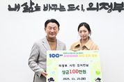 [ 중앙뉴스미디어 ] 의정부시는 11월 25일 시민 김지민 씨가 ‘100일간 사랑릴레이 배턴 잇기’에 동참해 성금 100만 원을 기부했다고 밝혔다. 김지민 씨는 “기부는 멀리 있는 것이 아니라 내가 할 수 있는 작은 실천에서 시작된다”며 “약소한 금액이지만 주변 어려운 이웃에게 전달돼 많은 도움이 됐으면 좋겠다”고 전했다. 김동근 시장은 “어려운 경제 상황 속에서도 따뜻한 나눔을 실천해 주신 김지민님께 감사드린다”며 “요즘같이 경제가 어려운 시기에 직접 땀을 흘려 번 돈을 이웃을 위해 기부하는 활동은 지역사회에 희망과 온기를 더해줄 것”이라고 말했다. 시는 지난 11월 5일부터 2026년 2월 12일까지 ‘100일간 사랑릴레이 배턴 잇기’ 모금 운동을 진행하고 있으며, 모금된 현금과 현물은 공동모금회와 연계해 의정부시 저소득층에게 지원하고 있다.
