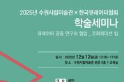 [ 중앙뉴스미디어 ] 경기도 수원시립미술관은 한국큐레이터협회와 함께 2025년 학술 세미나 '큐레이터 공동 연구와 협업-코퍼레이션 힙'을 주제로 12월 12일 오후 1시 수원시립미술관 행궁 본관에서 개최한다. 이번 세미나는 기관과 기획자 간 연구의 지평을 확장하는 담론의 장을 위해 수원시립미술관과 한국큐레이터협회가 업무협약을 체결하고 공동 연구와 협업 사례를 조명한다. 세미나는 “큐레이터 공동 연구와 협업-코퍼레이션 힙”을 주제로 김현숙 KISO미술연구소 소장이 한일 공동 연구 전시 사례로서 《한일 근대미술가들의 눈》의 연구 과정을 발표하며 세미나의 첫 문을 연다. 전북도립미술관 이애선 관장은 “빈손의 연대, 가득한 변화 – 연대는 선택이 아닌 책임”이라는 주제로 전라북도 소재 예술기관들의 협업과 연대 사례를 살펴보며, 이영준 김해문화관광재단 정책홍보팀장은 공동 연구와 협업 전시가 어우러진 사례로서 “문예회관 전시실, 협업과 연대로 풀어보는 대안들”을 발표한다. 2부에서는 한국화학연구원 고영주 전문경영위원이 “대전 과학예술 융합 사례”에 관한 연구를 공유하고, 박지영 독립큐레이터는 경남도립미술관에서 기획한 《실로 어마어마한