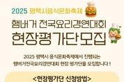 [ 중앙뉴스미디어 ] 평택시는 오는 25일 농업생태원에서 ‘2025 평택시 음식문화축제’를 통해 ▲전국 요리경연대회 ▲평택 지역 맛집 및 세계음식 시식·체험관 ▲노 오븐 베이킹 체험관 ▲탄소중립 실천·홍보관 등 다채로운 부스가 운영돼 시민들에게 풍성한 경험을 선사할 예정이다. 전국 요리경연대회는 ‘평택의 맛, 나만의 아이디어로 버거를 완성하다’를 주제로 총 18팀(일반부 10, 가족부 8)이 본선에 진출해 열띤 경연을 펼친다. 지난해와 달리 참가 부문이 일반부와 가족부로 확대됐으며, 시상 규모도 10팀 740만 원으로 늘어나 큰 기대를 모으고 있다. 경연대회의 생생한 현장을 함께할 시민 현장평가단도 사전 모집한다. 10월 24일(금) 오전 9시부터 오후 5시까지 일반부와 가족부 각 20명씩 무작위로 선착순 접수받으며, 편식 없는 고등학생 이상이라면 누구나 신청할 수 있고, 선정된 지원자는 실제 경연 현장에서 요리를 맛보고 평가하게 된다. 또한, 오전 10시에는 빵과당신 인재홍(대한민국 제과명장)이 진행하는 베이킹 체험이 마련돼 있으며, 참가 신청은 24일(금) 오전 10시부터 평택예총 공식 블로그 및 평택시청