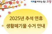 [ 중앙뉴스미디어 ] 고양특례시는 다가오는 추석 연휴를 맞아 시민들이 쾌적하고 깨끗한 환경 속에서 명절을 보낼 수 있도록 ‘추석 연휴 생활쓰레기 관리대책’을 수립해 본격 추진한다. 시는 10월 3일부터 9일까지 연휴 기간 동안 상황반과 기동청소반을 운영해 각종 민원과 긴급 상황에 신속 대응하고, 생활쓰레기와 무단 방치쓰레기를 집중 수거할 예정이다. 아울러 연휴 기간 쓰레기 배출일 사전홍보와 쓰레기 상습 투기 우려지역에 대한 집중 단속도 병행한다. 특히, 10월 8일 대체공휴일에도 생활쓰레기 수거를 정상적으로 실시해 시민 불편을 최소화할 방침이다. 다만, 10월 5일, 6일(월·추석), 7일 3일간은 휴무로 인해 수거가 이뤄지지 않는다. 이에 따라 쓰레기 배출은 반드시 수거일 전날 일몰 이후에 해야한다. 시 관계자는 “쾌적하고 깨끗한 명절 분위기 조성을 위해 추석 연휴 기간 생활쓰레기 수거에 만전을 기하겠다”며 “각 가정에서도 음식물 쓰레기 줄이기, 재활용품 분리배출 등 생활쓰레기 감량에 적극 협조해 주시기를 바란다”고 전했다.