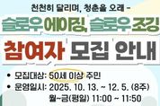 [ 중앙뉴스미디어 ] 고양특례시 일산서구보건소는 10월 13일부터 12월 5일까지(8주간) 진행되는 ‘슬로우에이징·슬로우조깅’ 프로그램 참여자를 모집한다고 밝혔다. ‘슬로우에이징·슬로우조깅’ 프로그램은 장·노년층 주민(만 50세 이상)을 대상으로 하며, 매주 평일 오전 11시부터 11시 50분까지 일산 기찻길공원에서 운영된다. 총 30명을 선착순 모집하며, 신청은 전화 접수로 받는다. 프로그램은 ▲1~4주차 ‘걷기 프로그램’(올바른 보행 자세·스트레칭·속도조절 훈련)과 ▲5~8주차 ‘슬로우조깅 프로그램’(저강도 조깅, 자세 교정, 지속 시간 연장)으로 구성된다. 이번 프로그램은 규칙적인 운동습관 형성뿐만 아니라 건강수명 연장 및 만성질환 예방에도 도움을 줄 수 있을 것으로 기대된다. 보건소 관계자는 “슬로우조깅은 관절에 부담이 적어 남녀노소 누구나 쉽게 실천할 수 있는 운동”이라며, “이번 프로그램에 많은 주민들이 함께 참여해 서로를 격려하며 건강한 생활습관을 형성하는 시간을 갖길 바란다”라고 전했다.