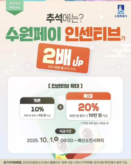 [ 중앙뉴스미디어 ] 수원시가 추석 명절을 맞아 10월 수원페이 인센티브를 20%로 확대한다.