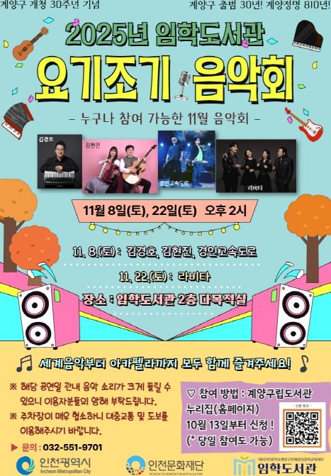 자세한 공연 안내 및 신청은 계양구립도서관 누리집을 참고하거나 임학도서관 종합자료실로 문의하면 된다.
