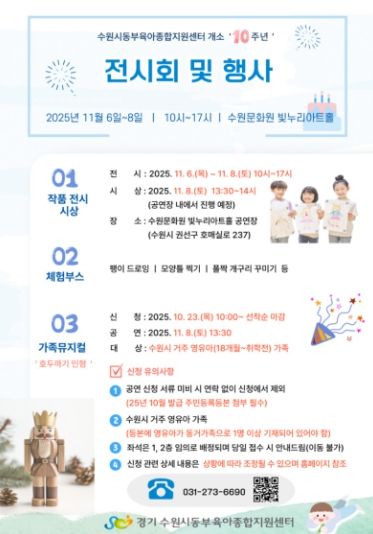 이은정 수원시동부육아종합지원센터장은 “센터가 지난 10년 동안 지역사회와 함께 성장할 수 있었던 것은 영유아와 가정을 위한 지속적인 관심과 지지 덕분”이라며 “이번 행사에 많은 가족이 참여해 예술로 공감하고 추억을 나누길 바란다”고 말했다.
