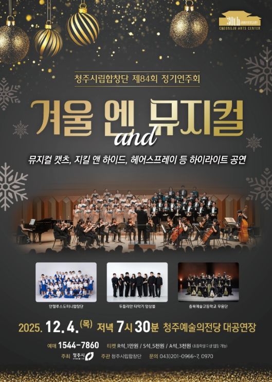 [ 중앙뉴스미디어 ] 청주시립합창단(예술감독 겸 상임지휘자 이민영)은 12월 4일 오후 7시 30분 청주예술의전당 대공연장에서 제84회 정기연주회‘겨울 엔(and) 뮤지컬’을 선보인다.