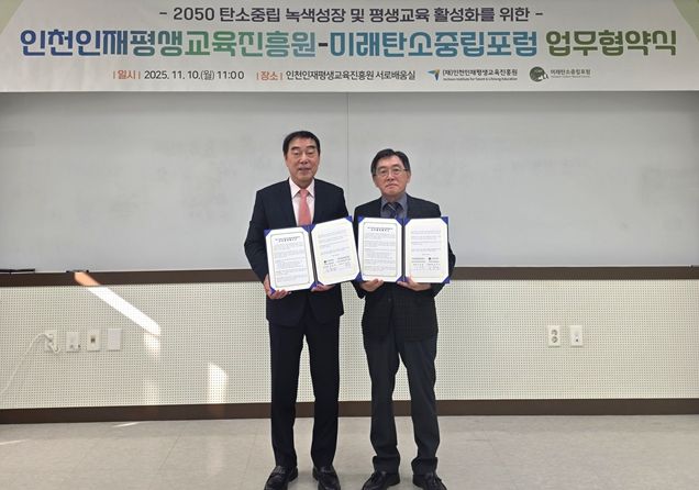 [ 중앙뉴스미디어 ] 2025년 11월 10일, 인천인재평생교육진흥원과 미래탄소중립포럼이 탄소중립 시민교육과 평생교육 활성화를 위한 업무협약(MOU)을 체결했다.