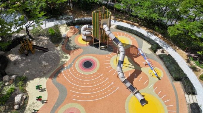 여러 명이 함께 탈 수 있는 꿈틀이 시소는 어린이들에게 인기이고, 트램펄린에서 멀리뛰기 경쟁을 하는 아이들의 웃음소리가 공원에 가득하다.
