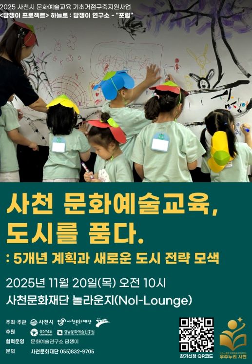 [ 중앙뉴스미디어 ] 사천문화재단이 오는 11월 20일 오전 10시, 사천문화재단 놀라운지에서 “사천 문화예술교육, 도시를 품다 : 5개년 계획과 새로운 도시 전략 모색”을 주제로 한 포럼을 통해 문화예술교육을 도시 발전의 핵심 동력으로 삼기 위한 중장기 전략을 공개한다.