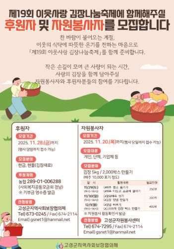 [ 중앙뉴스미디어 ] 고성군지역사회보장협의체는 오는 11월 29일부터 12월 1일까지 진행되는 제19회 이웃사랑 김장나눔축제를 위한 후원자 및 자원봉사자를 모집하고 있다고 밝혔다.
