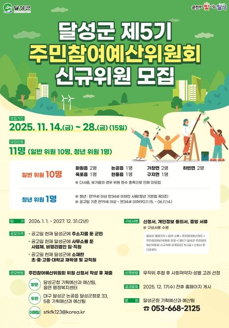 [ 중앙뉴스미디어 ] 달성군은 11월 14일부터 28일까지 제5기 주민참여예산위원회 신규위원 11명을 모집한다.