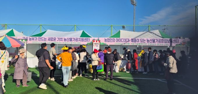 ‘농부가 만드는 새로운 가치 농산물가공지원센터’부스에서는 농산물가공지원센터에서 생산되는 11개 상품 과 수요자맞춤형 간편가공 상품화 시범사업으로 개발된 강된장과 취나물 제품과 우리군 대표농산물 옥수수를 가공해 만든 진공팩 쫀달고 찰옥수수 상품의 맛 평가도 진행되어 많은 군민들의 호응을 얻었다.