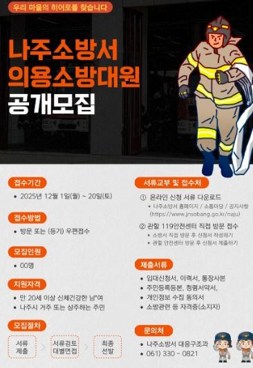 [ 중앙뉴스미디어 ] 나주소방서는 지역사회의 안전을 책임질 “2025년 하반기 의용소방대 신규대원 모집”에 나선다. 모집 기간은 오는 12월 1일부터 20일까지이며, 신천서류는 나주소방서 홈페이지 또는 나주소방서를 비롯한 119안전센터에서 지원 서류를 배부하고 접수를 진행한다.