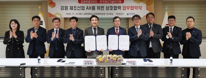 [ 중앙뉴스미디어 ] 강원특별자치도는 11월 27일 오후 3시, 강원 제조산업의 AX(AI Transformation, 인공지능 전환)를 위한 상호 협력을 강화하기 위해 한국생산기술연구원(원장 이상목)과 업무협약(MOU)을 체결했다.